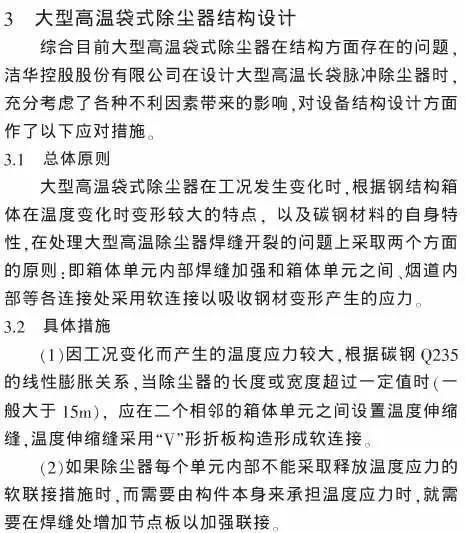摘要:分析大型高溫袋式除塵器在結(jié)構(gòu)方面存在的問題,提出設(shè)計(jì)的要點(diǎn)和技術(shù)措施,列舉實(shí)際應(yīng)用的范例,供同行參考交流。
