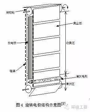 旋轉電極式電除塵器與常規電除塵器的除塵原理完全相同,在清灰方式上有很大改變。旋轉電極是由若干個小塊極板固定在板鏈上低速旋轉,極板由原來的整體壓型板改為小塊極板,通過板鏈帶動旋轉。其清灰方式采用旋轉鋼刷清灰,從根本上改變了常規電除塵器的振打裝置清灰,徹底避免了振打清灰造成的二次揚塵, 同時也解決了高比電阻粉塵的“反電暈”問題。